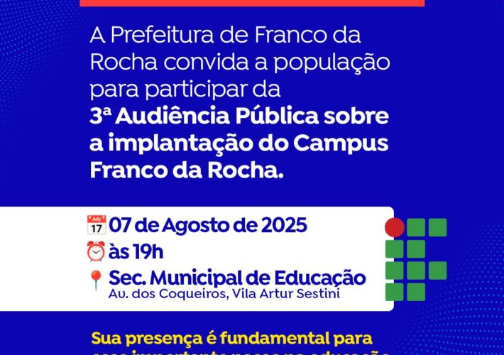 #Convite Convidamos todos para participar da 3ª Audiência Pública sobre a implantação do Campus do Instituto Federal em Franco da Rocha 07 de agosto, às 19h...