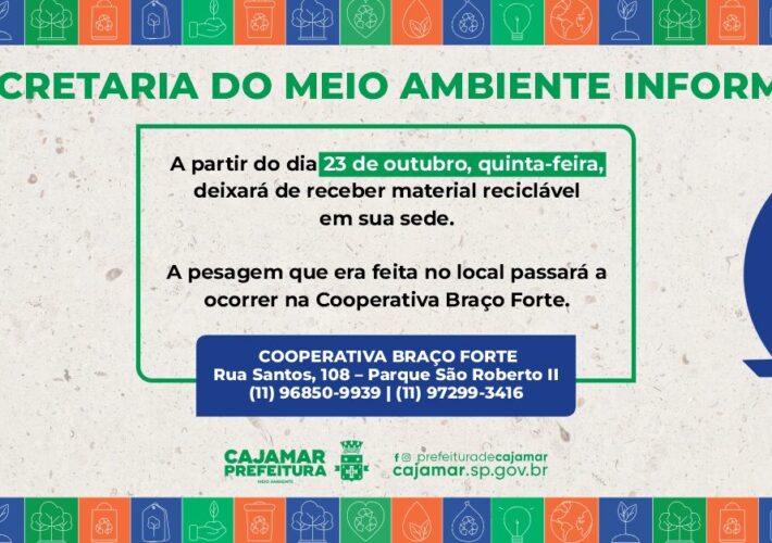 A Prefeitura de Cajamar, por meio da Secretaria do Meio Ambiente, comunica que, a partir do dia 23 de outubro, quinta-feira, deixará de receber material reciclável...