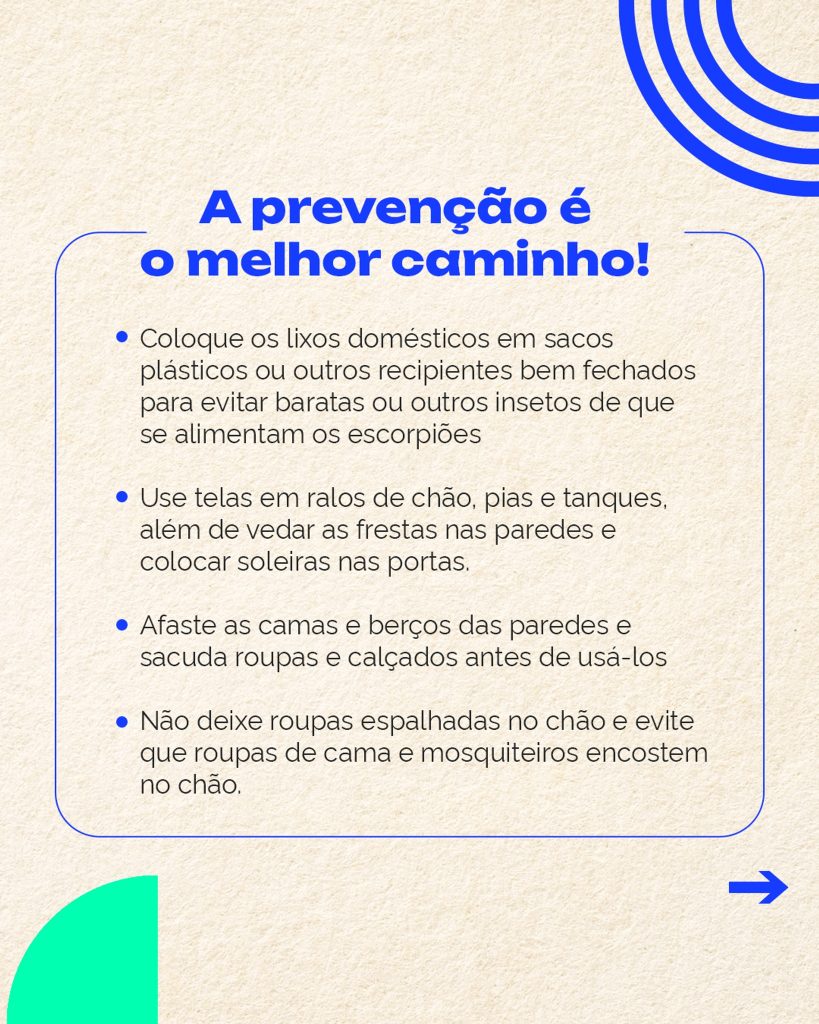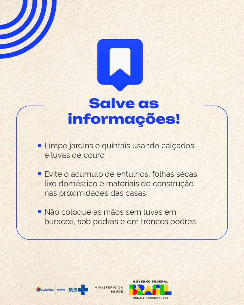 Confira algumas dicas do Ministério da Saúde, para se prevenir e saber como agir caso você ou alguém próximo sofra com a picada do animal.