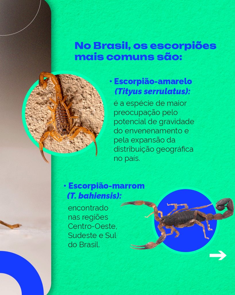 No Brasil, os escorpiões mais comuns são: Escorpião-amarelo, Escorpião-marrom, Escorpião-preto-da-amazônia e Escorpião-amarelo-do-nordeste.