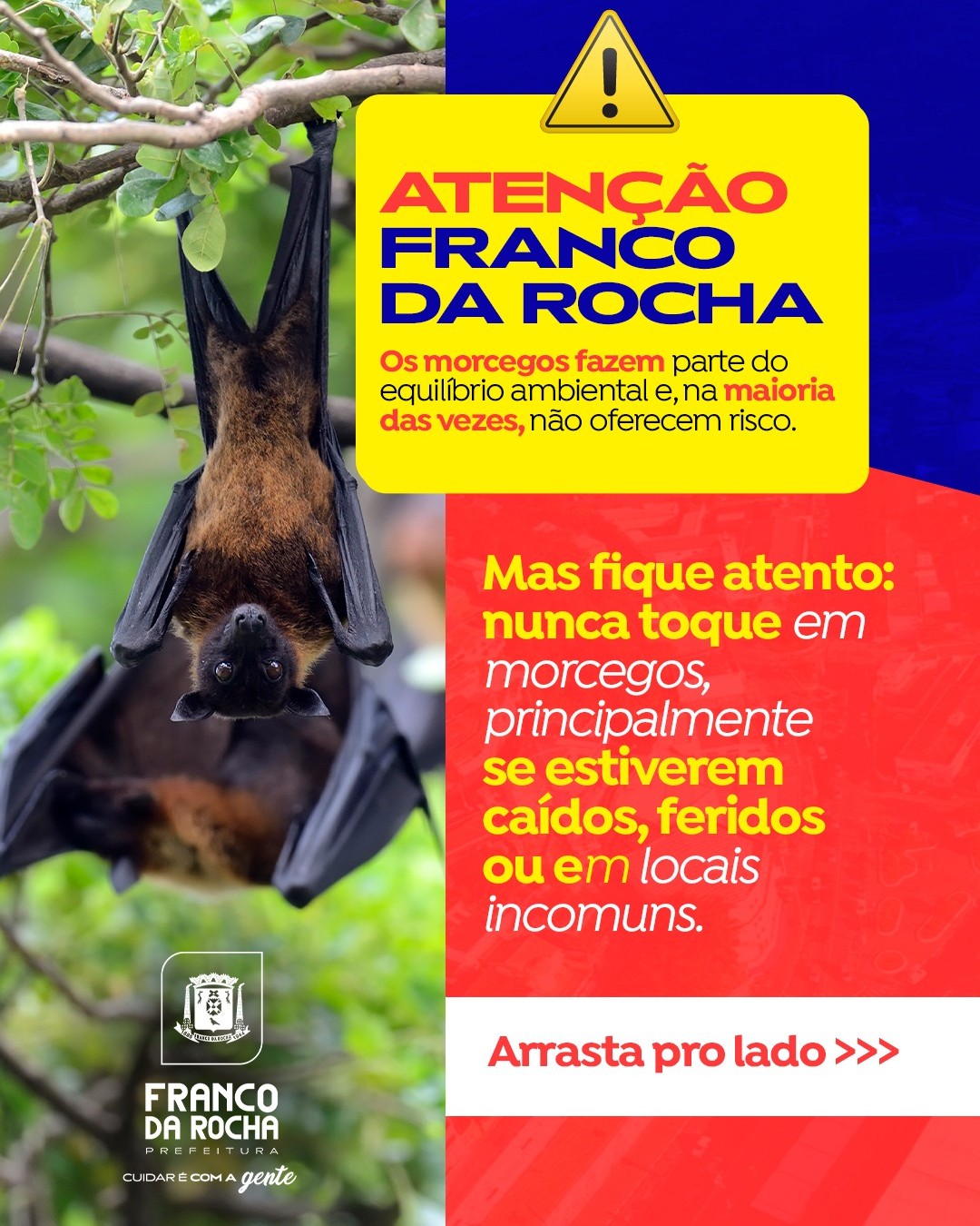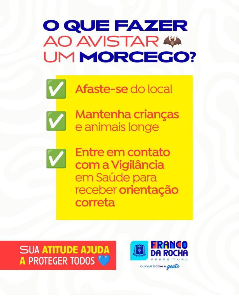 ❌ Nunca toque em morcegos, principalmente se estiverem caídos, feridos ou em locais incomuns.