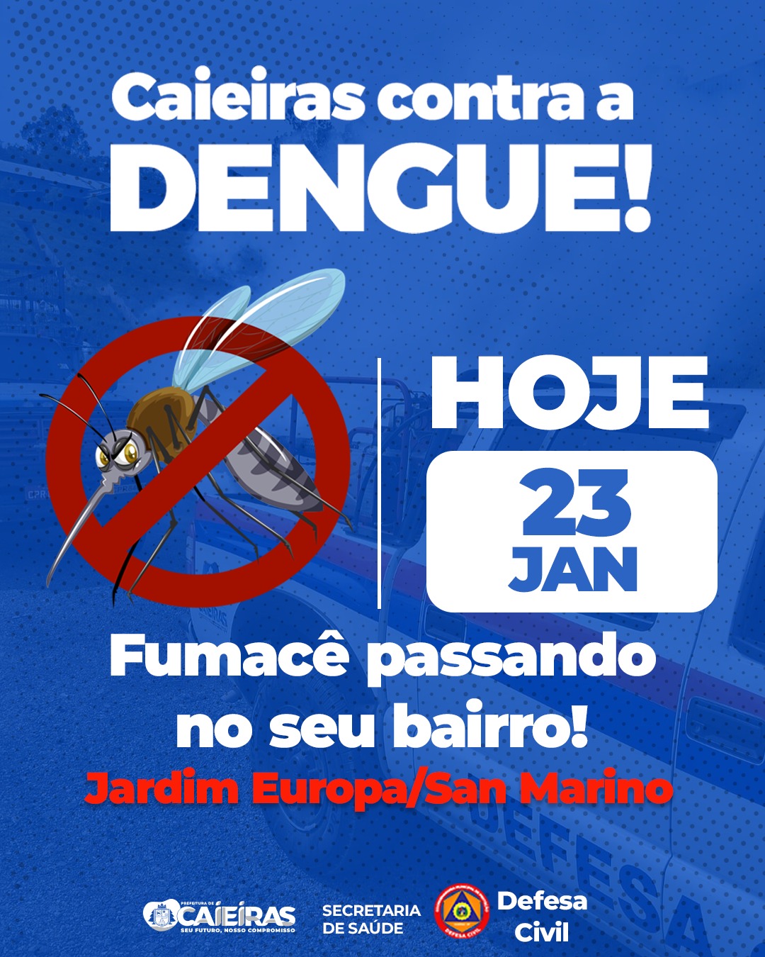 Hoje, dia 23, o fumacê estará nos bairros Jd. Europa e San Marino, atuando no combate ao mosquito Aedes aegypti. Para o tratamento ser mais eficaz, é importante que mantenham as janelas abertas e, se possível, também as portas.