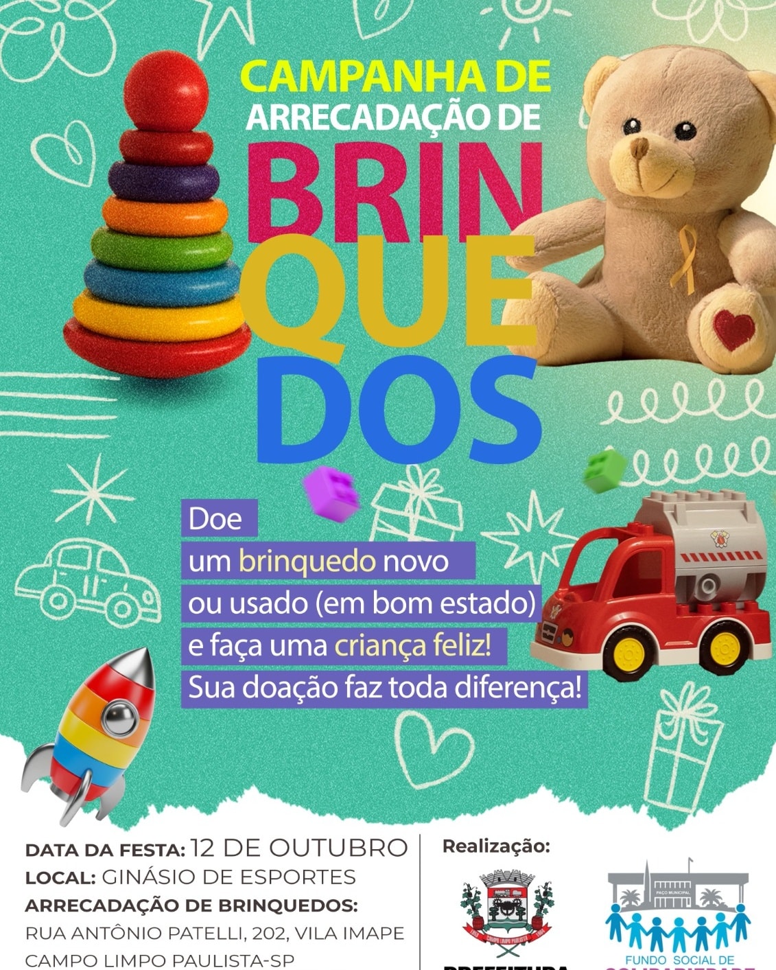 O Fundo Social de Solidariedade está arrecadando brinquedos para tornar o 12 de outubro um dia inesquecível para as crianças em situação de vulnerabilidade social da nossa cidade. 💙