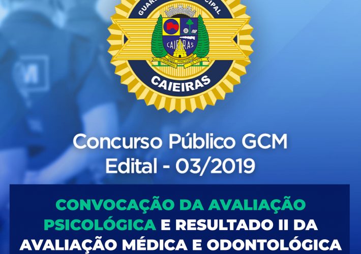 A Prefeitura de Caieiras torna público o resultado II da avaliação médica e odontológica e convocação para avaliação psicológica do concurso Nº 03/2019 da Guarda Civil...
