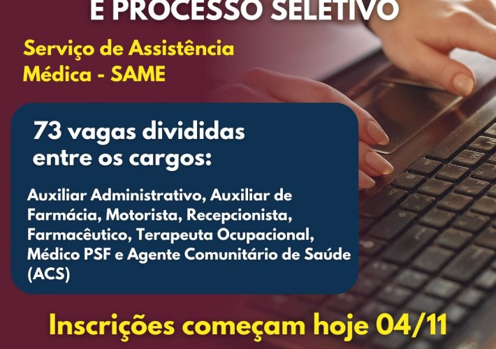 Começam hoje (04) as inscrições do concurso público para diversas vagas e do processo seletivo de agente comunitário de saúde (ACS) do SAME. Ao total serão...