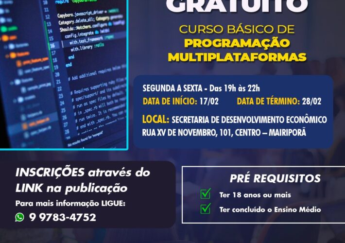 A Prefeitura, por meio da Secretaria de Desenvolvimento Econômico, está com inscrições abertas para o Curso Básico de Programação Multiplataformas! Se você quer dar os primeiros...