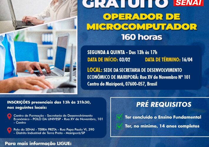CURSO GRATUITO DE OPERADOR DE MICROCOMPUTADOR! A Prefeitura de Mairiporã, em colaboração com o SENAI, disponibiliza o curso de Operador de Microcomputador! Uma ótima chance para...