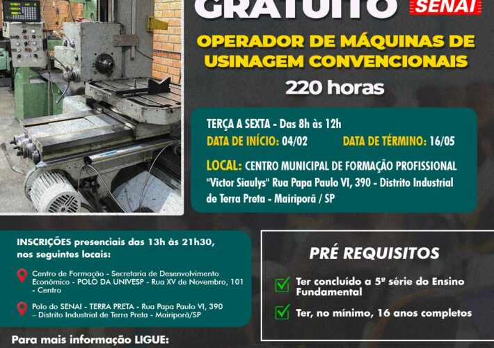 CURSO GRATUITO: OPERADOR DE MÁQUINAS DE USINAGEM CONVENCIONAIS! A Prefeitura de Mairiporã, em parceria com o SENAI, está com mais uma oportunidade imperdível para quem quer...