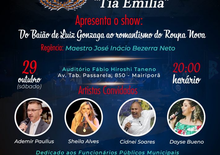 No sábado 29, ás 20h, a Prefeitura de Mairiporã, através da Secretaria da Cultura, promove no Centro Educacional, apresentação da Banda Marcial Tia Emilia com o...