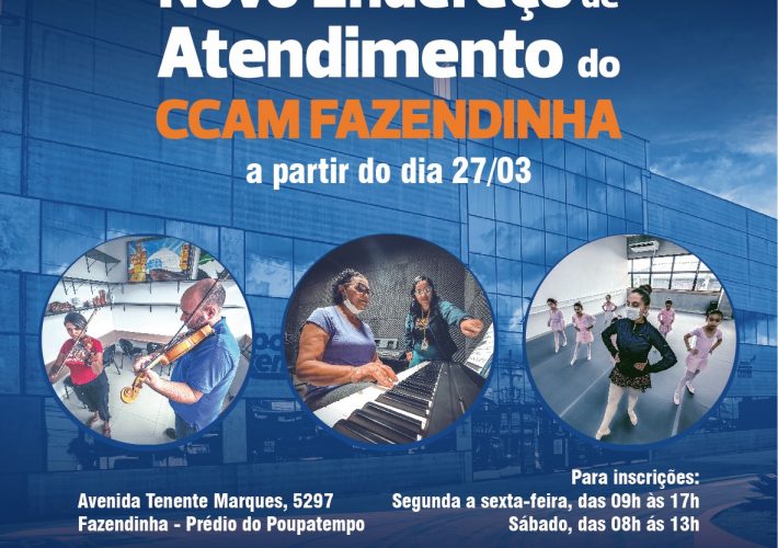 A Secretaria de Cultura e Turismo, informa que o CCAM Fazendinha, está atendendo em novo endereço: Local: Avenida Tenente Marques, 5297 – Fazendinha Prédio do Poupatempo.