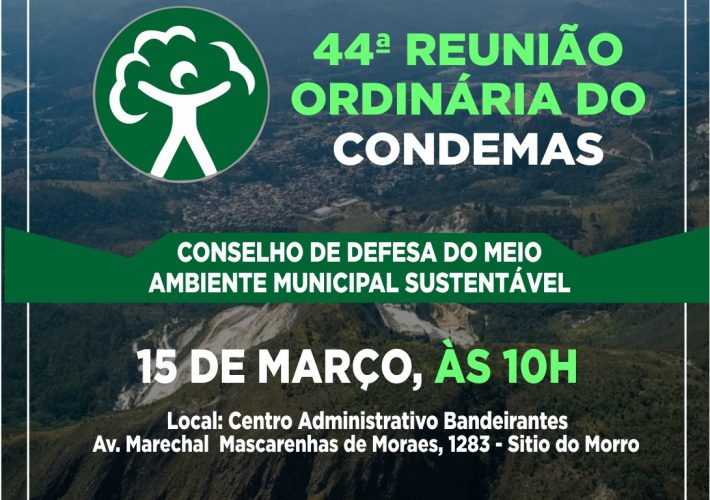 Informamos que a 44ª Reunião Ordinária do Conselho Defesa do Meio Ambiente Municipal Sustentável – CONDEMAS, acontecerá no dia 15/03, às 10h com transmissão ao vivo...