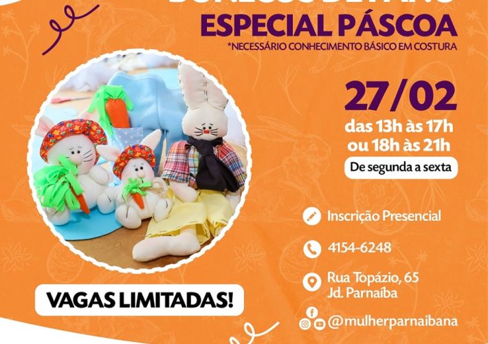 A Secretaria da Mulher e da Família irá realizar a partir do dia 27/02 o curso de Bonecos de Panos – Especial Páscoa, com duas turmas,...