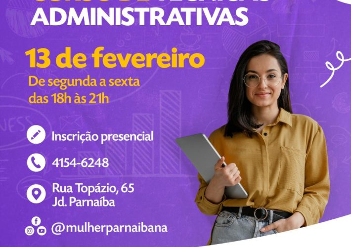 A Secretaria da Mulher e da Família irá realizar a partir do dia 13/02 o curso de Técnicas Administrativas, com uma turma, das 18h às 21h,...