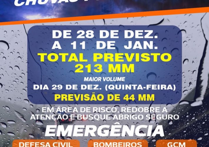 A Defesa Civil de Santana de Parnaíba alerta que, entre 30 de dezembro e 11 de janeiro, há condições para chuvas intensas e contínuas acompanhadas por...