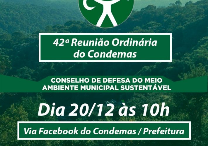 Informamos que a 42ª Reunião Ordinária do Conselho Defesa do Meio Ambiente Municipal Sustentável – CONDEMAS, acontecerá no dia 20/12, às 10h com transmissão ao vivo...
