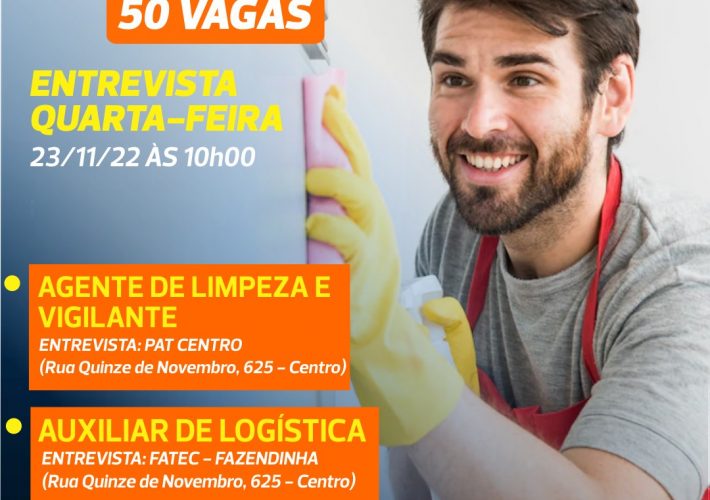 Oportunidade de emprego, processo seletivo nesta quarta-feira (23), para a vaga de auxiliar de limpeza, vigilante e auxiliar de logística.São 50 vagas no total, tanto para...