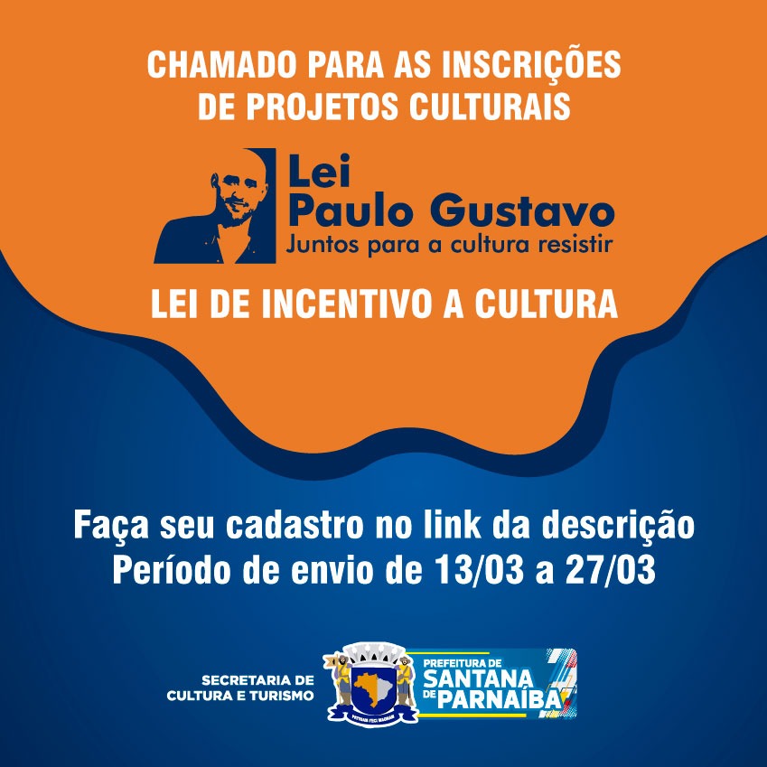 A Prefeitura de Santana de Parnaíba, por meio da Secretaria de Cultura e Turismo, informa a realização de Consulta Pública da Lei Paulo Gustavo, destinada para integrantes da área cultural de Santana de Parnaíba, bem como demais interessados em participar da elaboração e implementação da Lei Paulo Gustavo (Lei complementar nº 195 de 08 de julho de 2022) no município.