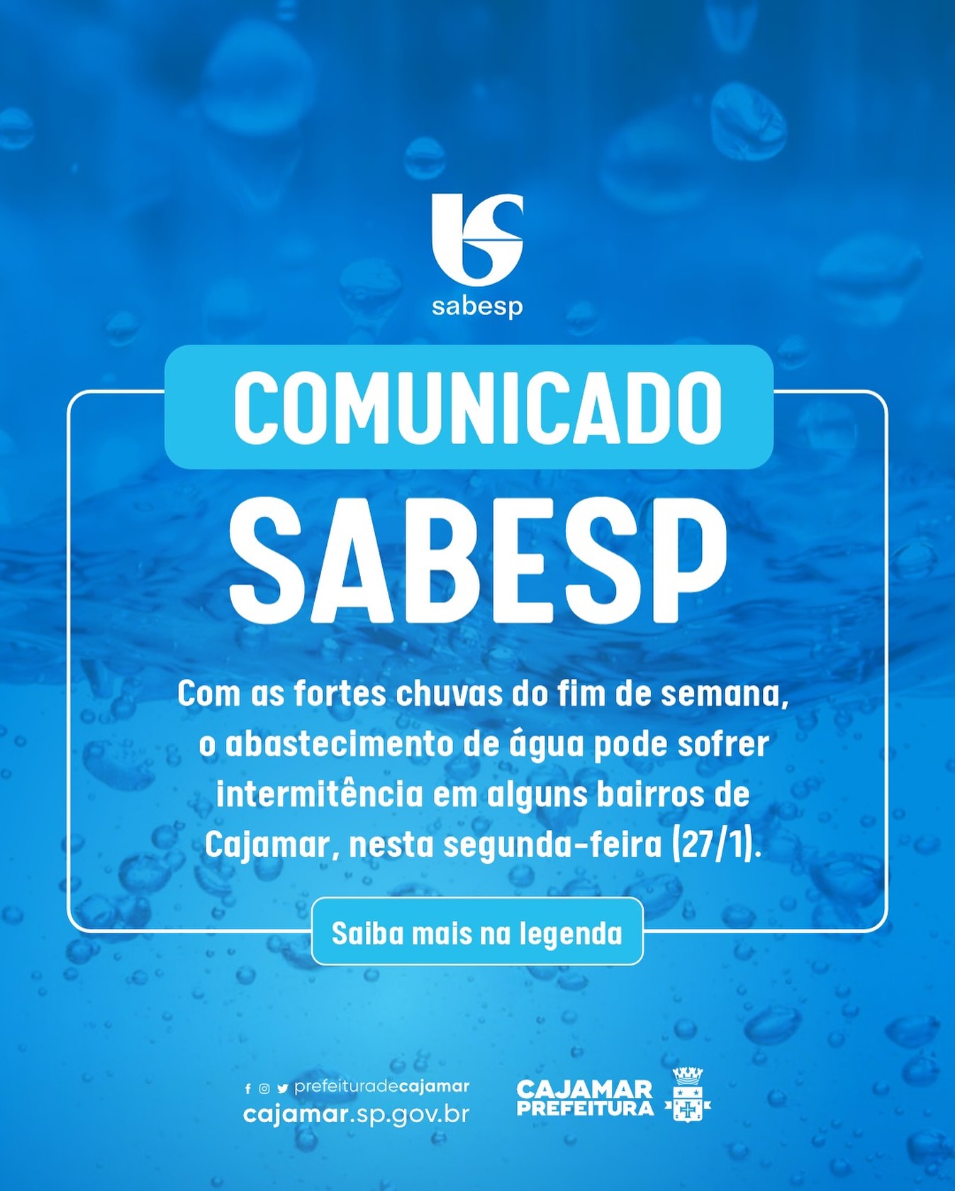 Com as fortes chuvas do fim de semana, o abastecimento de água pode sofrer intermitência em alguns bairros de Cajamar nesta segunda-feira (27/1).