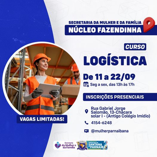 A Secretaria da Mulher e da Família irá realizar do dia 11 a 22/09 o curso de Logística, com uma turma 13h às 17h, ministradas de segunda a sexta-feira, totalizando 40 horas de aprendizado.