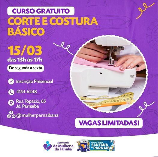 A Secretaria da Mulher e da Família irá realizar a partir do dia 15/03 o curso de Corte e Costura Básico, com uma turma, das 13h às 17h, ministradas de segunda a sexta-feira, totalizando 40 horas de aprendizado.