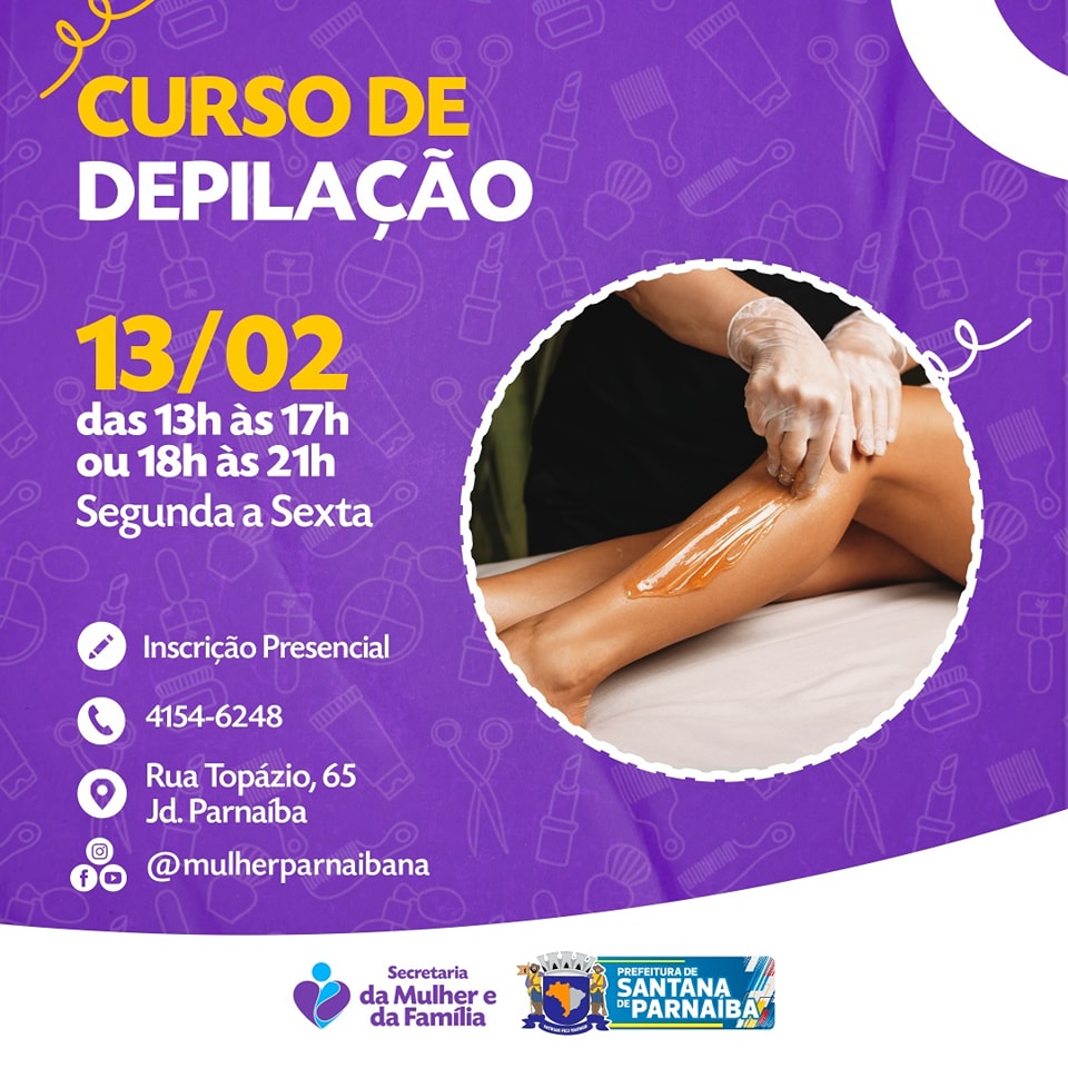 A Secretaria da Mulher e da Família irá realizar a partir do dia 13/02 o curso de Depilação, com duas turmas, uma das 13h às 17h ou 18h às 21h, ministradas de segunda a sexta-feira, totalizando 40 horas de aprendizado.