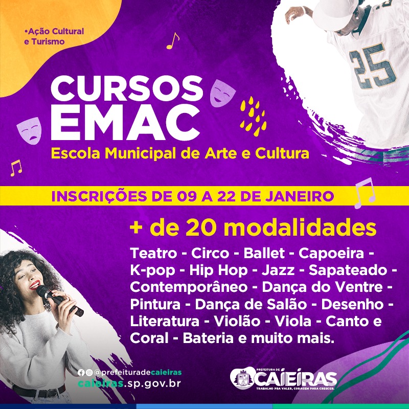 Até o dia 22/01, a Escola Municipal de Artes de Caieiras (EMAC) está aberta para novas inscrições para os 23 cursos que ela disponibiliza.