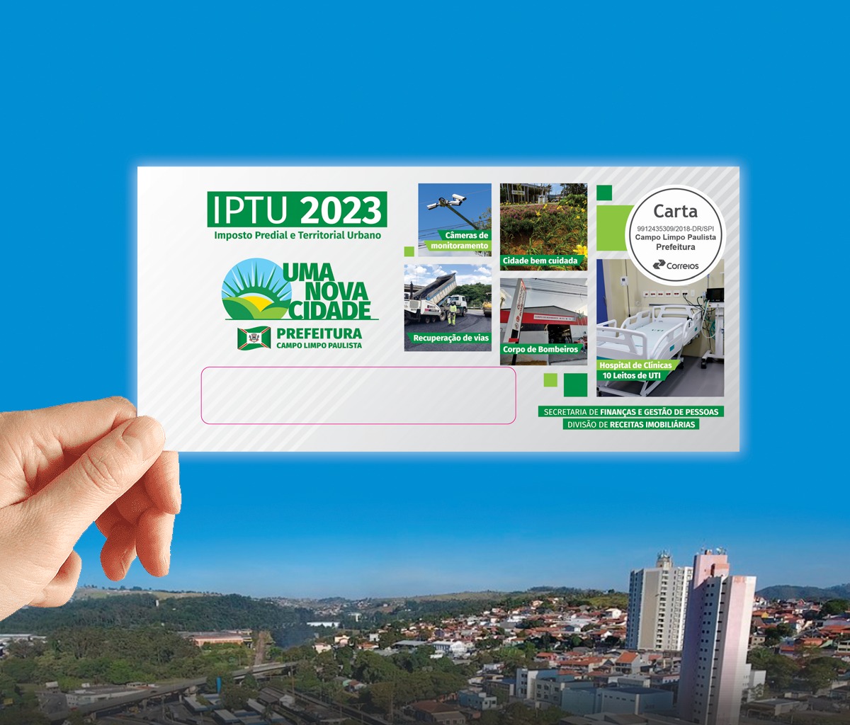 A Secretaria Municipal de Finanças e Gestão de Pessoas de Campo Limpo Paulista informa que a data limite para pagamento à vista do carnê do IPTU, em cota única, com desconto de 10%, é nesta segunda-feira (27). Para quem quiser parcelar o pagamento, sem o desconto, a primeira parcela vence também nesta segunda-feira (27).