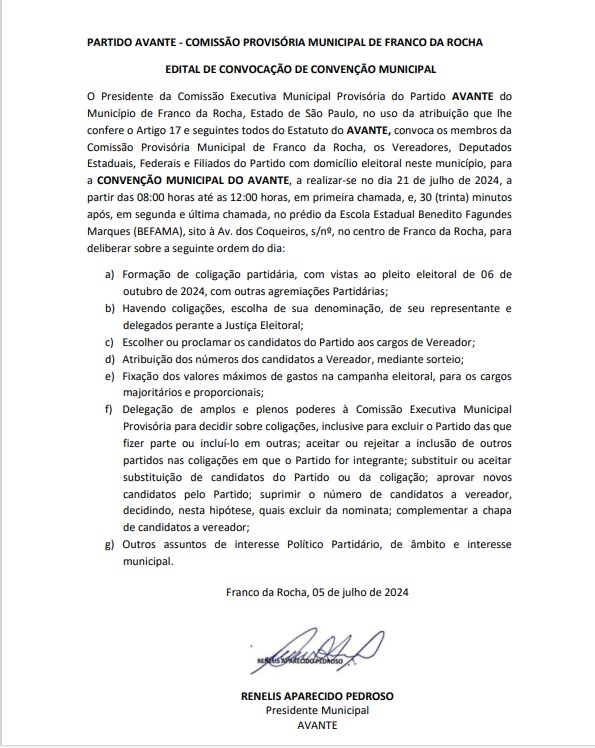 Franco da RochaThe estimated reading time is less than a minute EDITAL DE CONVOCAÇÃO PARA CONVENÇÃO MUNICIPAL PARTIDÁRIA DE FRANCO DA ROCHA Redação Cidade Agora 08/07/2024 0 Compartilhe Post navigation Previous article Prefeitura disponibiliza declaração referente às fortes chuvas que atingiram a cidade nos dias 8 e 9 de outubro Next article EDITAL DE CONVOCAÇÃO PARA CONVENÇÃO MUNICIPAL PARTIDÁRIA DE FRANCO DA ROCHA