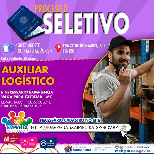 Dia: 30/08 (Quinta-feira) – às 9h: AUXILIAR LOGÍSTICO