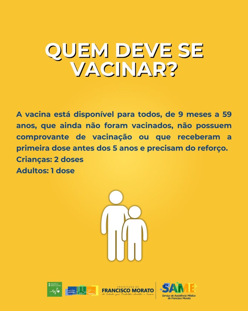 A vacina está disponível para todos, de 9 meses a 59 anos, que ainda não foram vacinados, não possuem comprovante de vacinação ou que receberam a primeira dose antes dos 5 anos e precisam do reforço. As crianças recebem 2 doses conforme o calendário, enquanto os adultos recebem 1 dose.