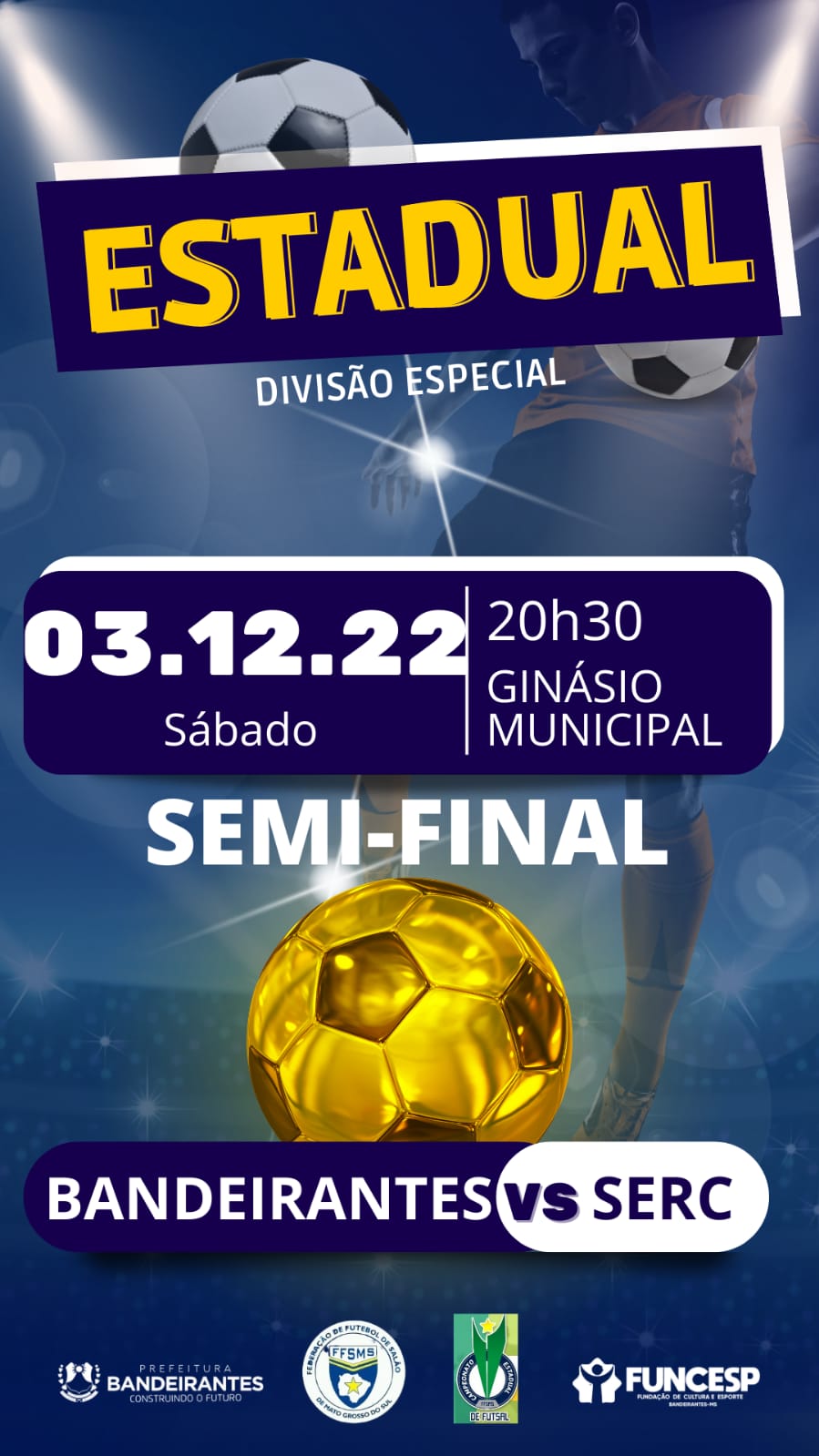 No próximo sábado (03), acontece a semifinal do Campeonato Estadual de Futsal em Bandeirantes. O adversário é a equipe da SERC de Chapadão do Sul. O jogo terá início às 20h30, no Ginásio Municipal.