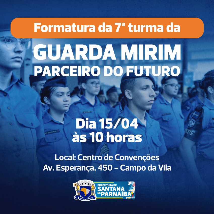 Você é nosso convidado para a Formatura da 7ª Turma da Guarda Mirim Parceiro do Futuro, que acontecerá dia 15/04 às 10h.