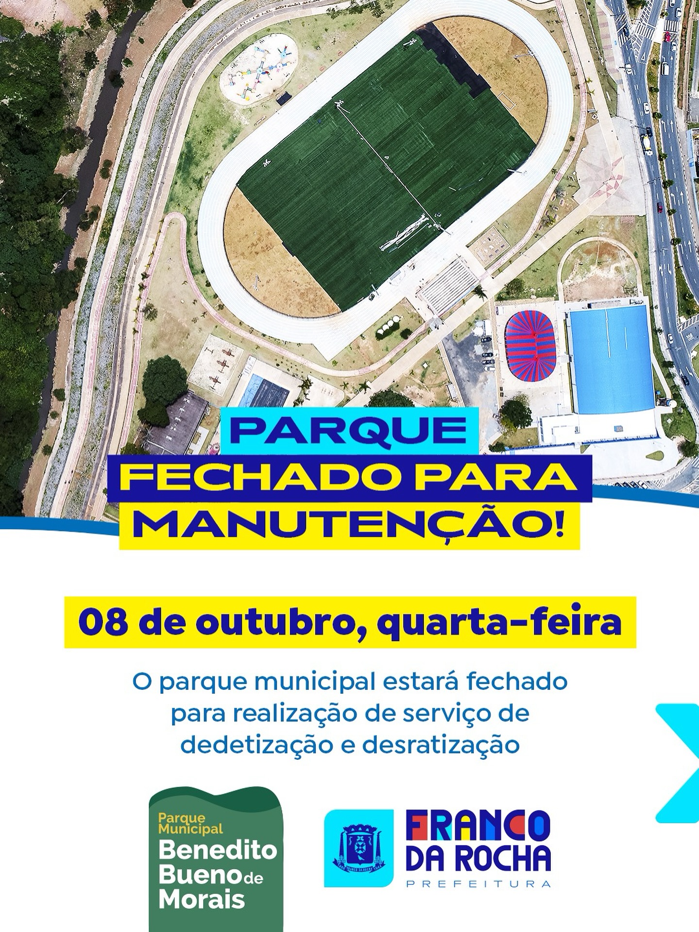 Franco da RochaThe estimated reading time is less than a minute Franco da Rocha informa: Parque fechado para manutenção Redação Cidade Agora 07/10/2025 0 Parque fechado para manutenção! No dia 08 de outubro (quarta-feira), o Parque Municipal Benedito Bueno de Morais estará fechado para a realização de serviços de dedetização e desratização. Agradecemos a compreensão e colaboração de todos Compartilhe Post navigation Previous article Bolsa Família exigirá biometria a partir de novembro Next article Mais uma ação em prol da segurança das mulheres em Franco da Rocha