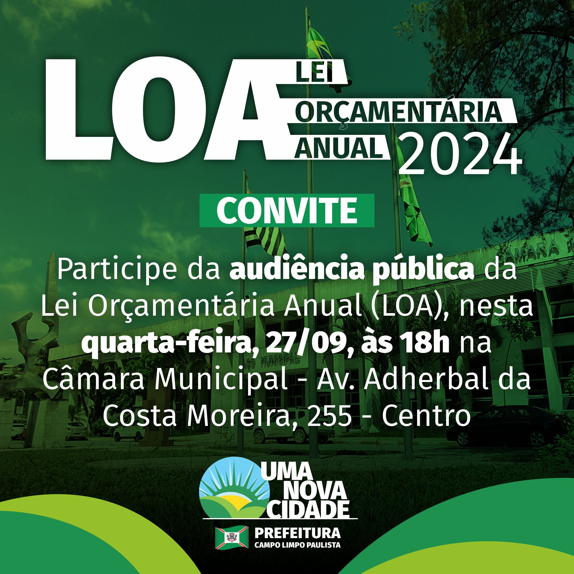 Nesta quarta-feira, 27, a partir das 18h, tem audiência pública para discussão da Lei Orçamentária Anual (LOA) para 2024, na Câmara Municipal (Avenida Adherbal da Costa Moreira, 255 – centro). A LOA funciona como um direcionamento para os gastos e despesas do governo e indica o orçamento para o ano seguinte. A audiência é aberta ao público.