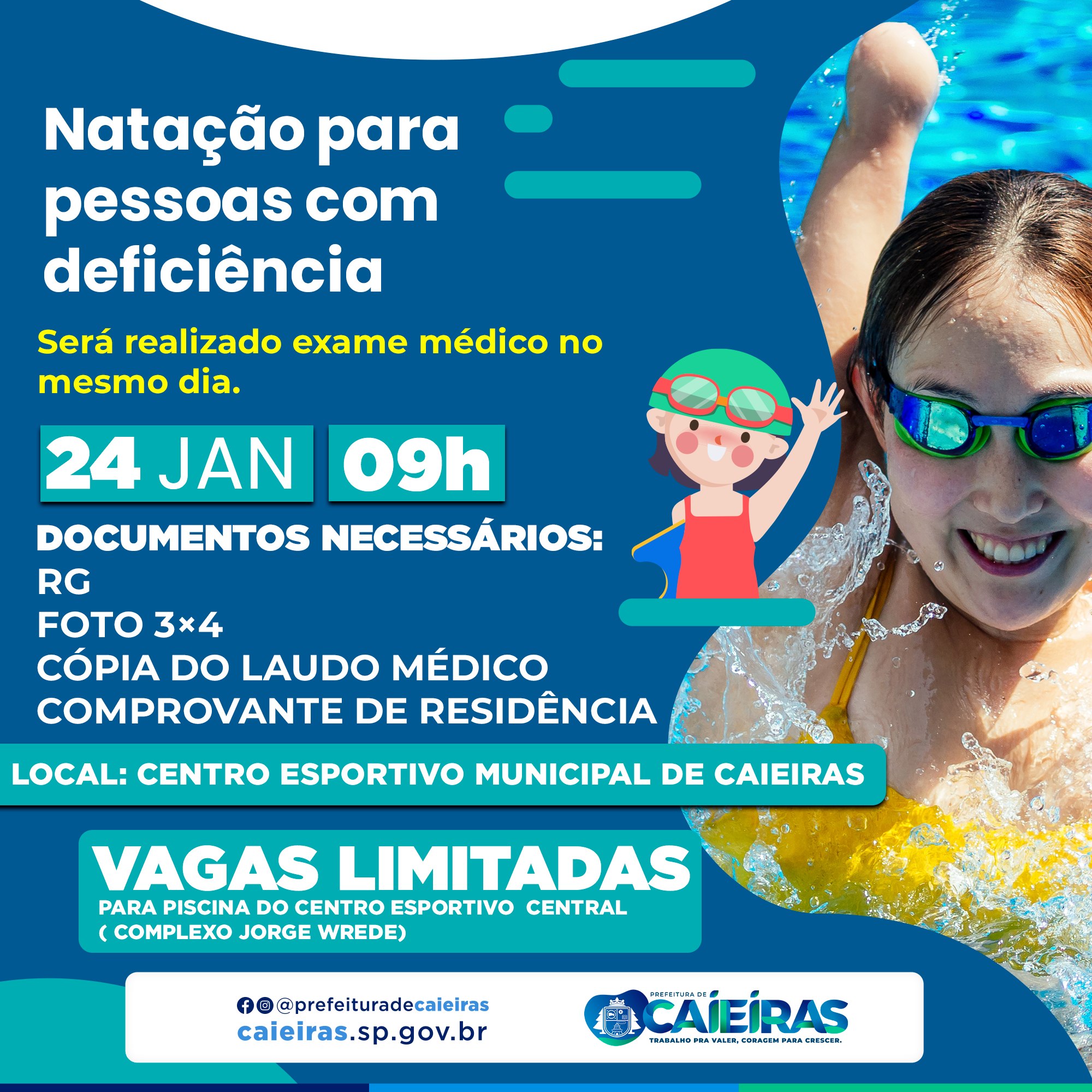 O Centro Esportivo de Caieiras abre inscrições para novas turmas PcD, que acontecerá somente no dia 24/01, às 9h. Para fazer a inscrição é só comparecer ao Centro Esportivo (Rua Portugal, 300 – Centro) no dia e horário mencionados acima, levando foto 3×4, RG, comprovante de residência e cópia do laudo médico. O exame médico será realizado no mesmo dia da inscrição.