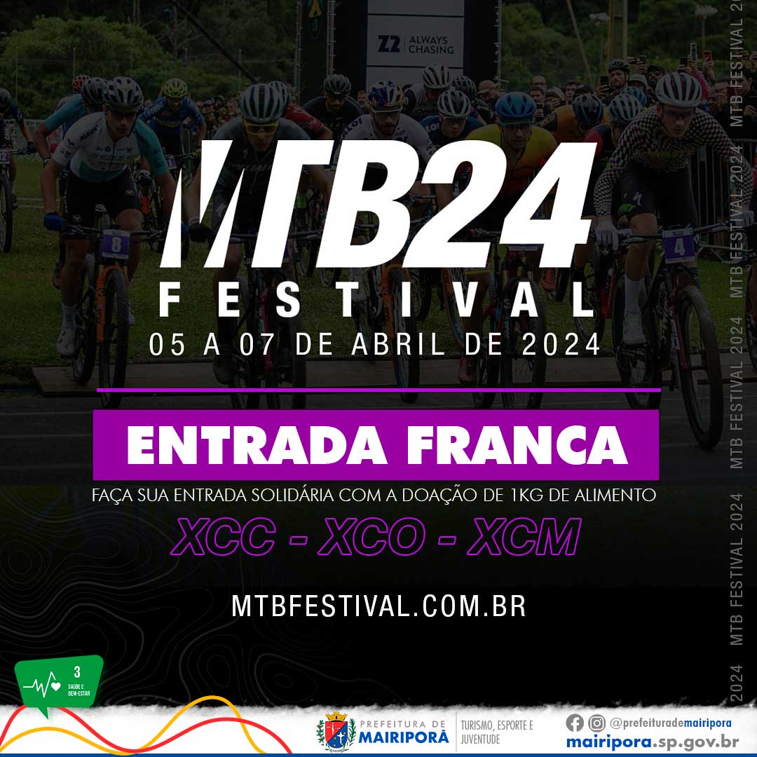 Mairiporã recebe de 05 a 07 de abril, a partir das 7h, o MTB Festival 2024, maior prova de mountain bike do Brasil. O evento que conta com apoio da Prefeitura de Mairiporã, através da Secretaria de Turismo, Esporte e Juventude, recebe alguns dos maiores atletas de ciclismo nas categorias XCC Open e XCM (amadores), XCC e XCO (federados), para disputas que acontecerão na mesma pista da abertura da Copa do Mundo de MTB, a UCI World Cup Series, uma semana depois. Com isso, os atletas terão a oportunidade de competir em uma prova de XCO com pontuação C1 da UCI e Ranking Nacional.