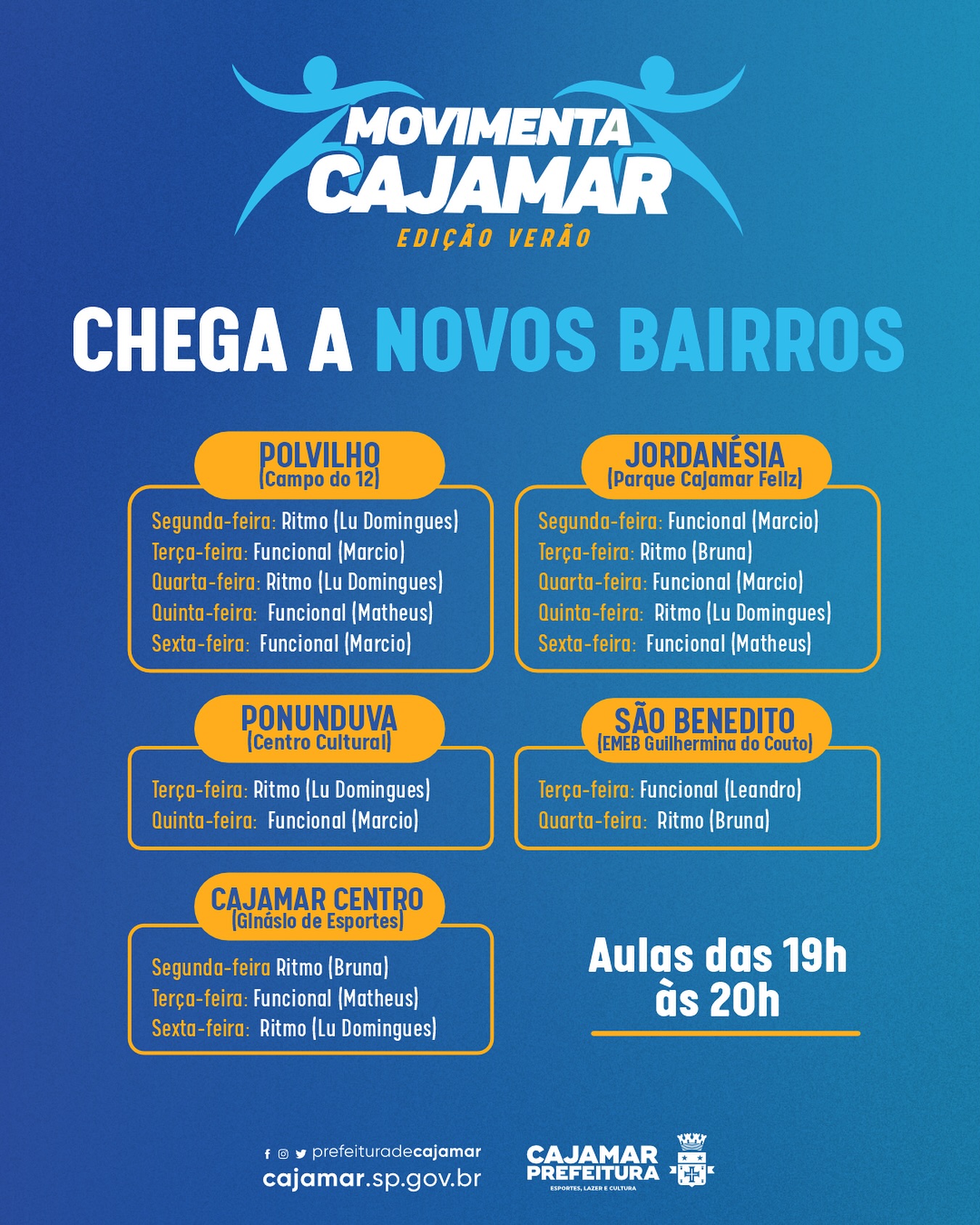 O projeto “Movimenta Cajamar – Edição Verão” está conquistando cada vez mais participantes e expandindo sua atuação! A partir da próxima sexta-feira (31), os moradores de Cajamar Centro também poderão participar das aulas gratuitas de ritmos e treinos funcionais no Ginásio de Esportes.