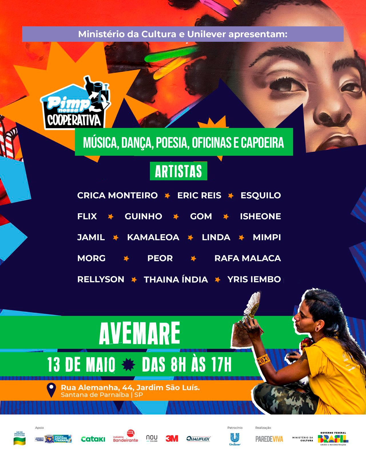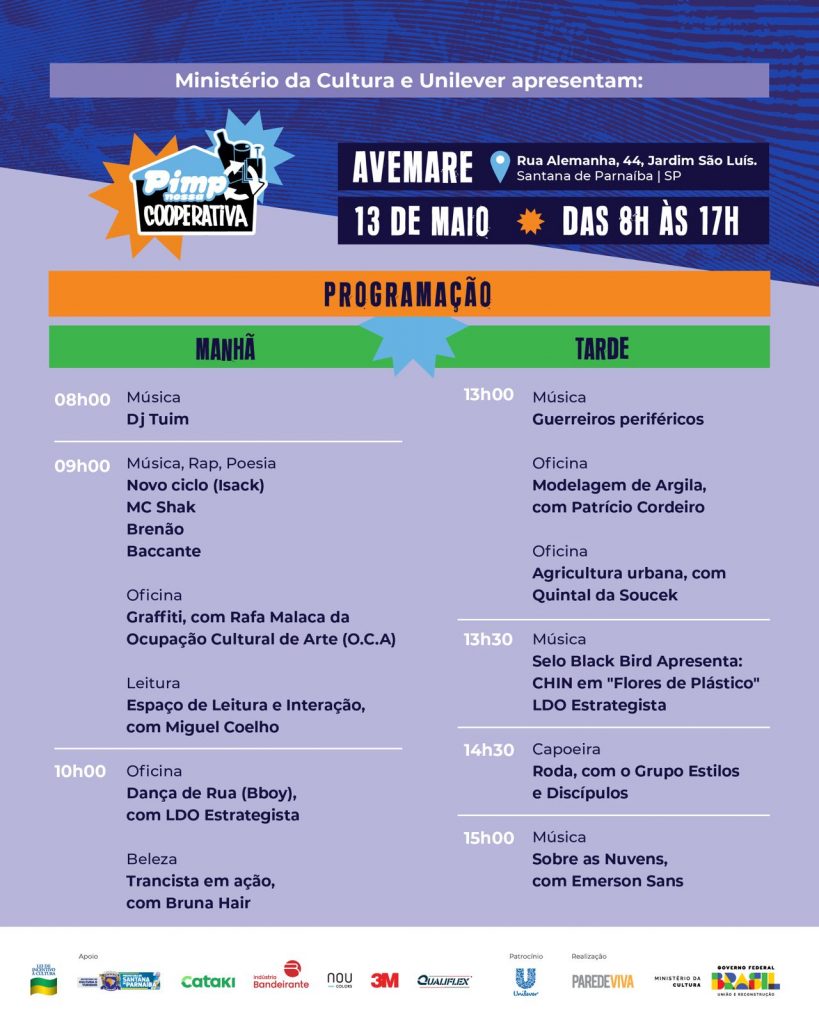 No dia 13 de maio das 08h às 17h, na Rua Alemanha, 44, no bairro Jardim São Luís – Santana de Parnaíba, a Cooperativa Avemare em parceira com a Secretaria de Cultura recebe a segunda edição do “Pimp Nossa Cooperativa 2023”.
