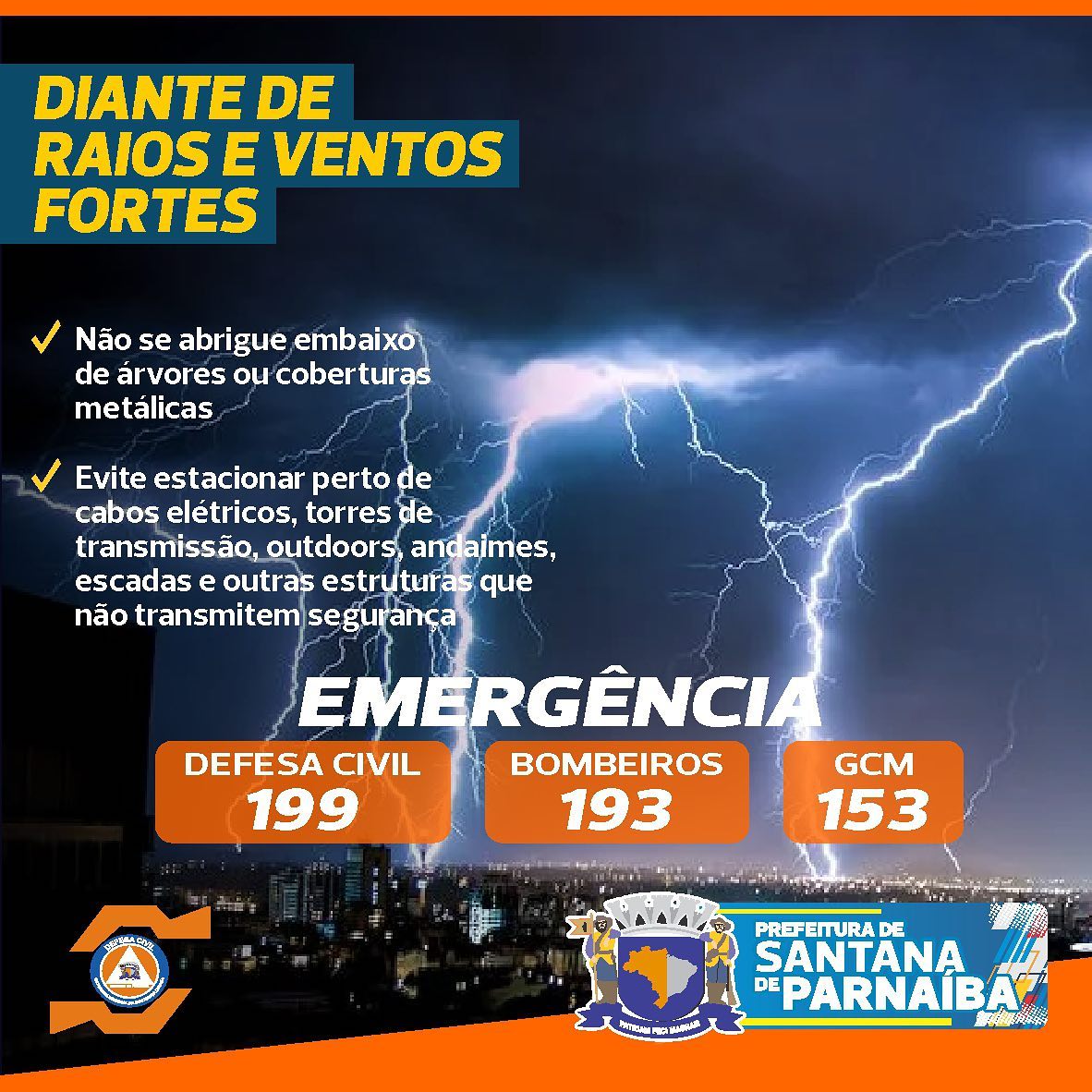 A Defesa Civil de Santana de Parnaíba alerta que, entre 30 de dezembro e 11 de janeiro, há condições para chuvas intensas e contínuas acompanhadas por descargas elétricas, fortes rajadas de vento e granizo na cidade.