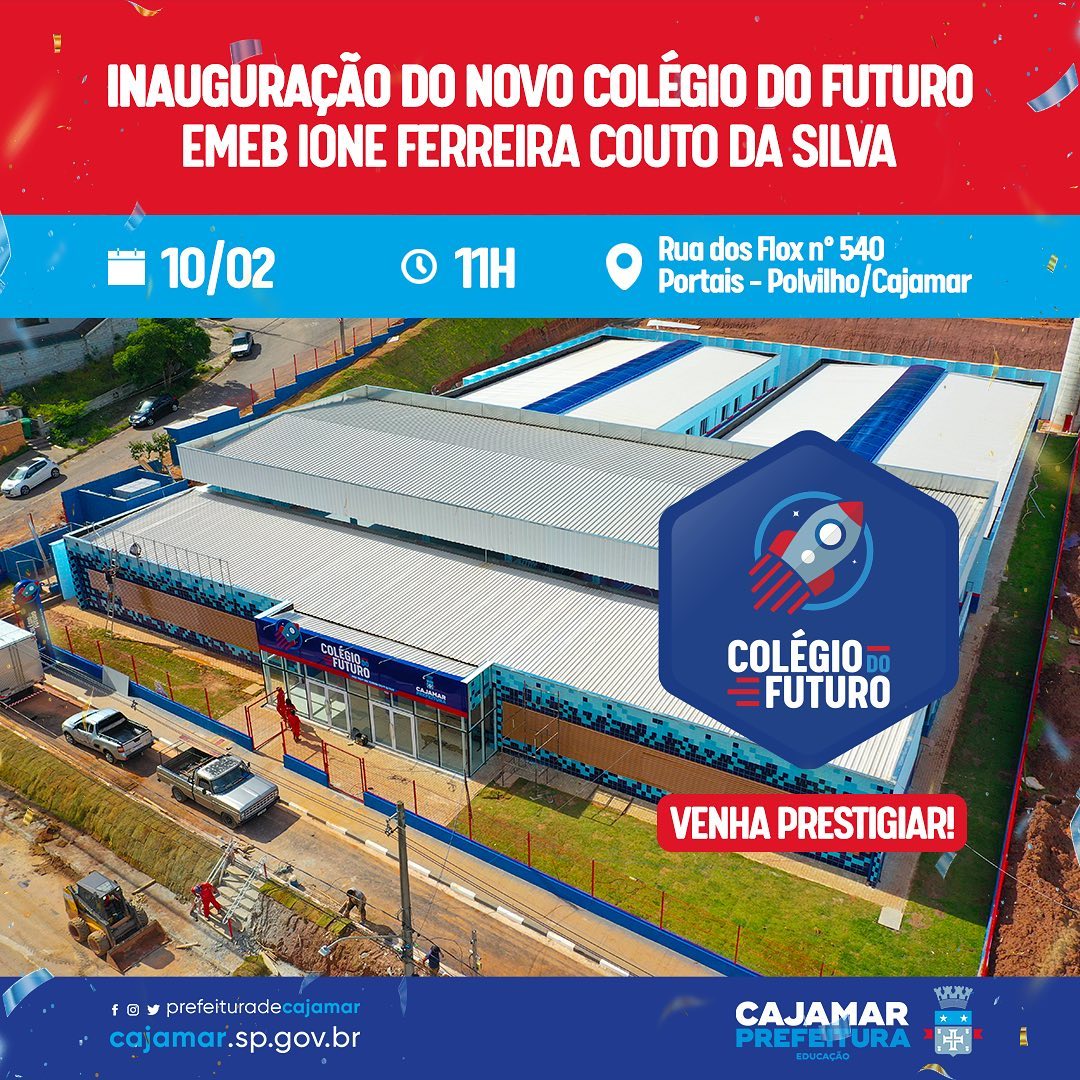 Nesta sexta-feira (10), acontece a inauguração de mais uma unidade do Colégio do Futuro, e é com grande alegria que a Prefeitura de Cajamar convida a população para estar presente neste momento tão especial para a nossa cidade!