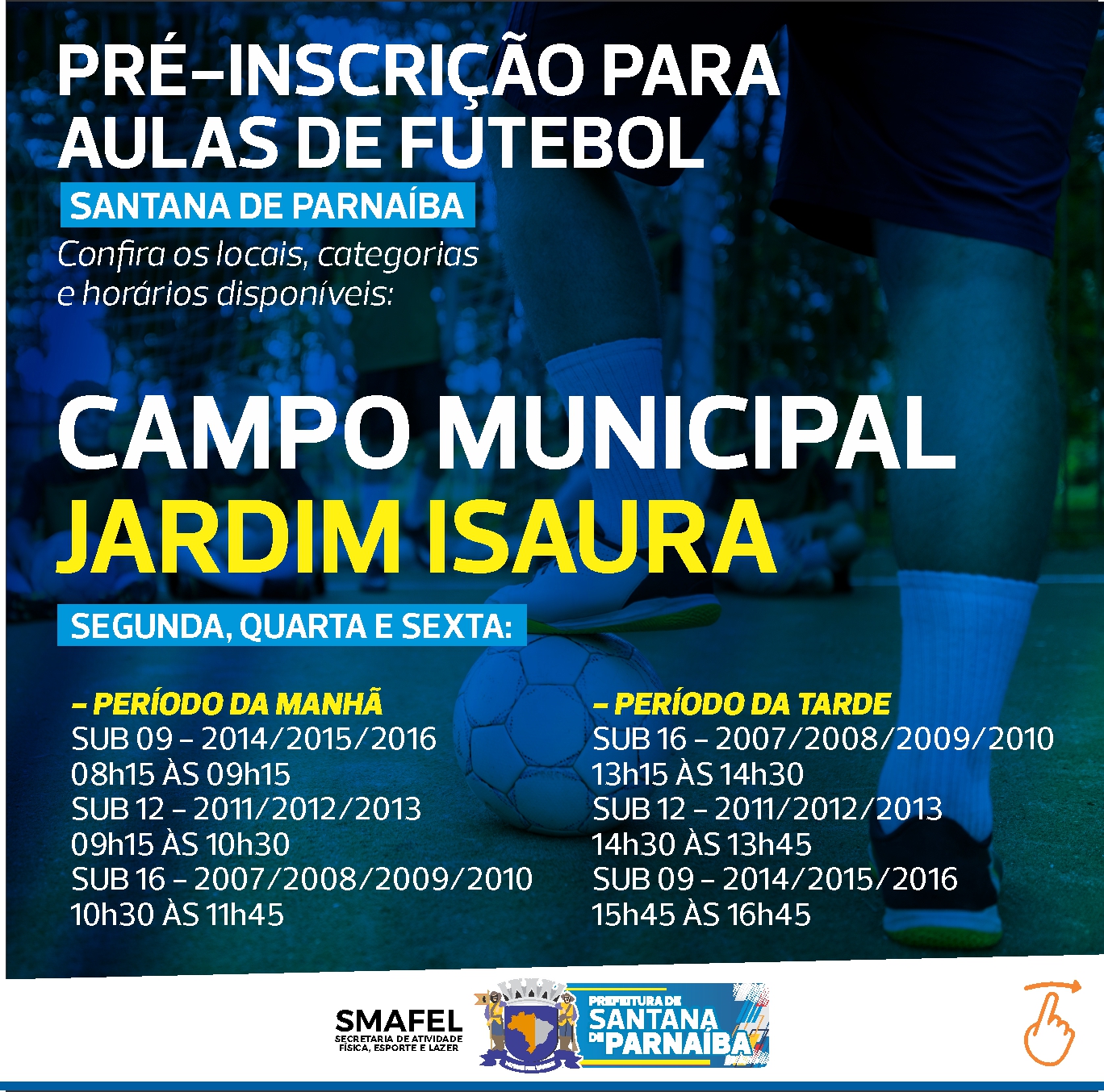 A Secretaria de Atividade Física, Esporte e Lazer está com pré-inscrição para as aulas de futebol. As aulas serão ministradas nos períodos da manhã e tarde nos campos e parques municipais.
