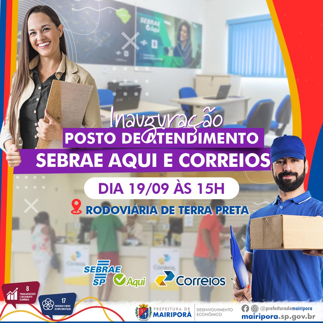 Na terça –feira, 19, a Prefeitura de Mairiporã, através da Secretaria de Desenvolvimento Econômico, irá inaugurar, na rodoviária de Terra Preta, um Posto de Atendimento do Sebrae Aqui e um dos Correios.