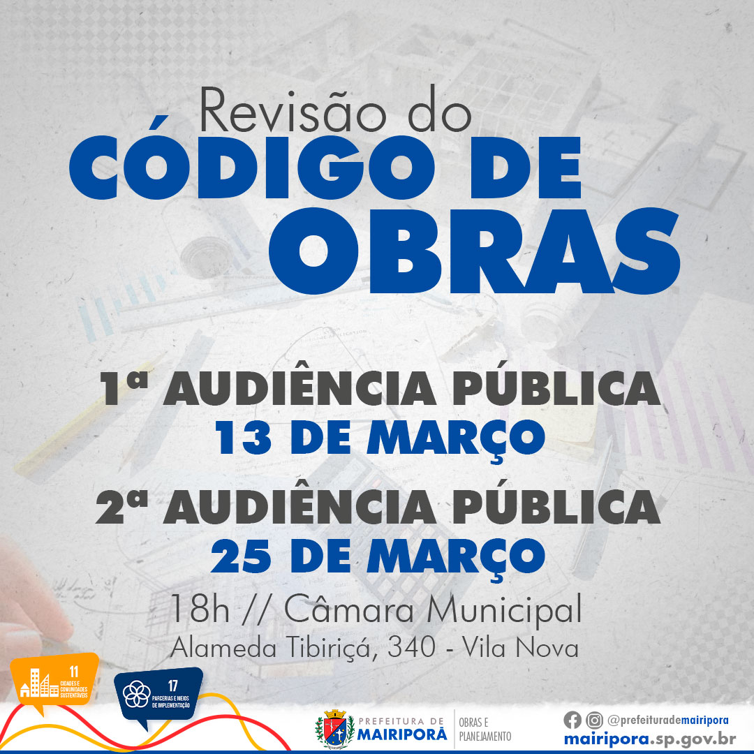 A Prefeitura de Mairiporã, através da Secretaria de Obras e Planejamento, realizará na quarta-feira, 13, e na segunda –feira,25, Audiência Pública sobre a revisão do Código de Obras do município.