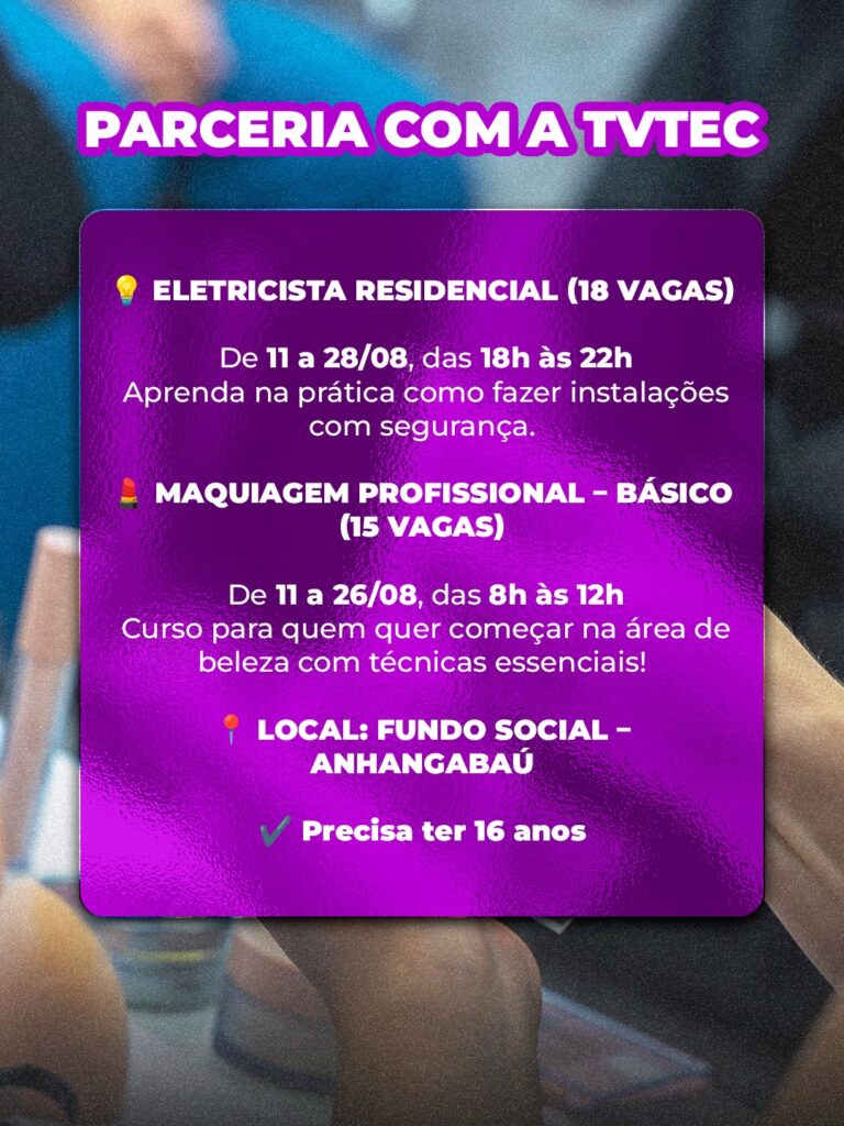São oportunidades em áreas como tecnologia, elétrica e beleza, em parceria com o SENAI Jundiaí e a TV TEC.