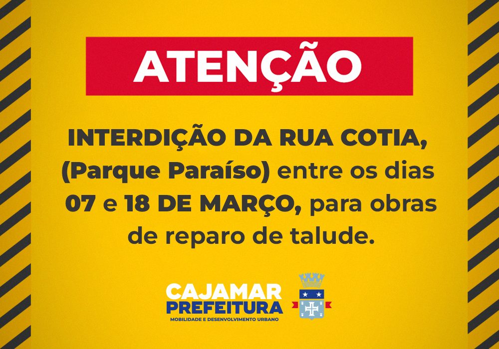 A rua Cotia, que liga as ruas Fernando Prestes e Corumbataí, no Parque Paraíso, distrito do Polvilho, terá o trânsito interditado a partir desta terça-feira (7), para a realização dos trabalhos de reparo de talude que ocorrem no local. A medida é necessária devido à realização de uma obra de drenagem no trecho da via. A previsão é de que o serviço se estenda pelos próximos onze dias com previsão de liberação de tráfego na via a partir do dia 18 de março.