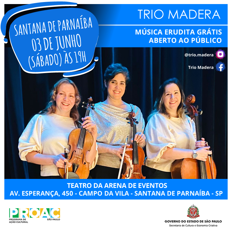 No dia 03 de junho a Arena de Eventos receberá um evento musical gratuito de música Erudita, o grupo Trio Madera.