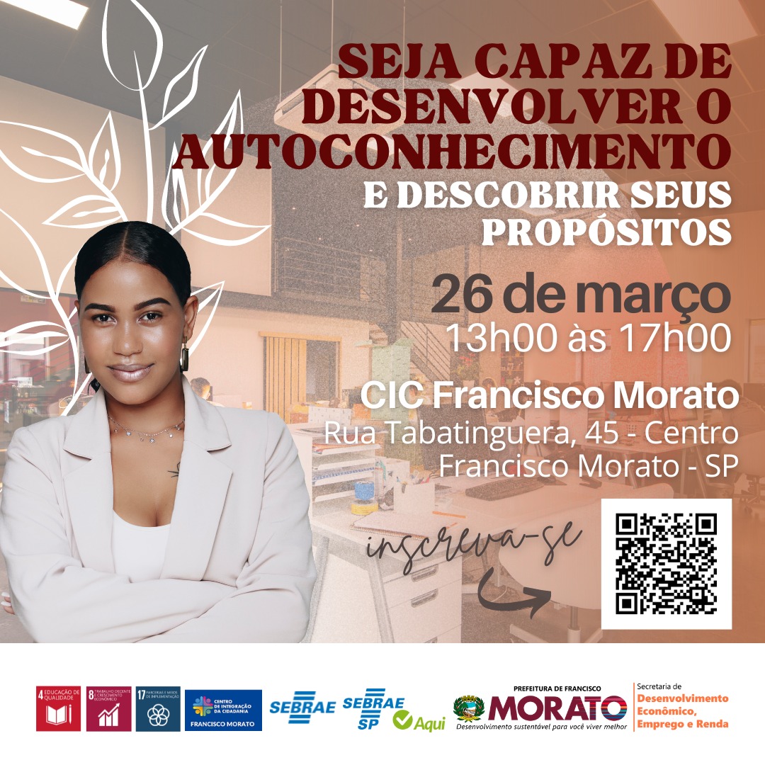 O Sebrae de Francisco Morato te convida para participar da palestra “Seja Capaz de desenvolver o seu autoconhecimento”, o evento é presencial e totalmente gratuito.